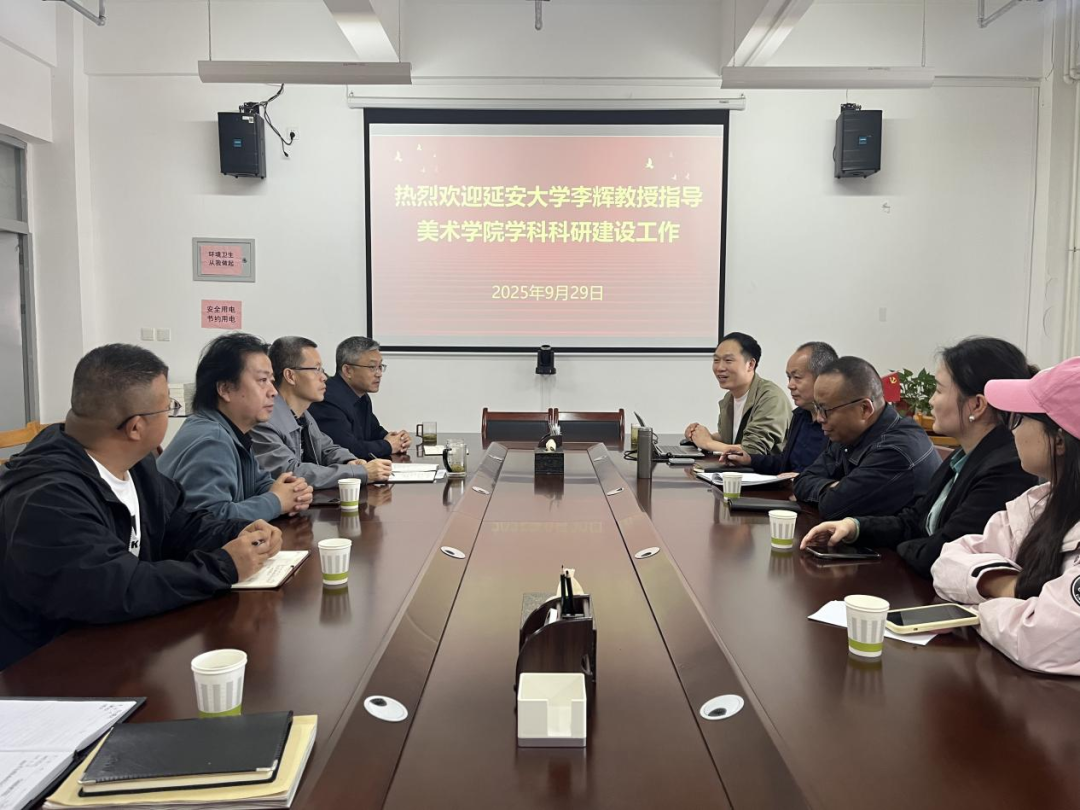 9月29日,渭南师范学院美术学院特邀延安大学鲁迅艺术学院副院长李辉教授莅临学院,于会议室召开学科科研建设工作座谈会,指导美术学院学科科研建设工作。会议由美术学院院长石海彬主持,学院全体处科级领导干部、系主任及各专业负责人共同参加。