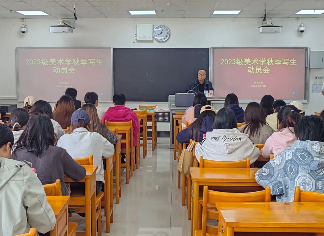 9月29日中午,学院2023级美术学专业秋季写生动员会在主教楼顺利召开。本次会议旨在部署写生课程的教学安排、安全规范及专业要求,为国画与油画方向的学生及教师提供明确指导。会议由副院长刘涌涛、专业负责人王月海及全体代课教师参加,2023级美术学专业全体学生分方向参会。