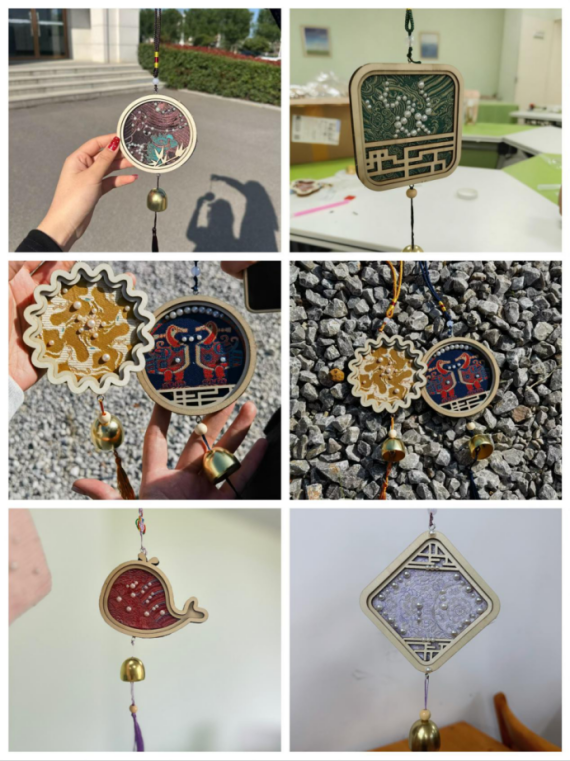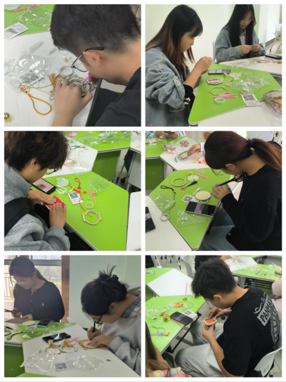 在创作环节,学生们迅速投入状态,充分发挥专业特长与创意灵感,现场气氛温馨而热烈,随着一件件独具匠心的风铃作品逐渐完成,清脆悦耳的铃声此起彼伏,仿佛奏响了一曲舒缓心灵的乐章。同学们互相欣赏作品,交流制作心得,脸上洋溢着轻松愉悦的笑容。参与活动的同学纷纷表示:“专注于手工的过程非常治愈,当听到自己制作的风铃发出清脆声响时,感觉积累的压力真的随风飘散了。”