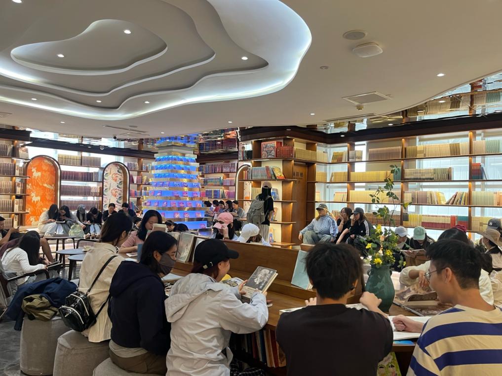 出站后,同学们乘大巴车前往敦煌书局参观学习。敦煌书局的建筑非常有特色。外观借鉴莫高窟洞窟形态,采用弧形路线设计和暖色调灯光和系统,尤其是二楼的玻璃地面,里面展示众多的古籍影印本,让人眼前一亮!空间装饰借鉴敦煌壁画典型元素,包括反弹琵琶飞天造型藻井、九色鹿主题墙绘及仿石窟拱门结构。这空间设计无愧于“2023年缪斯设计奖商业空间类金奖”!在欣赏书局特色建筑的同时,大家在书局里查阅了很多敦煌莫高窟的文献资料。