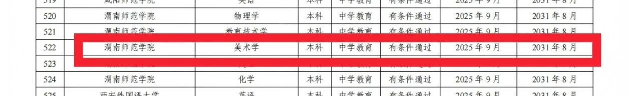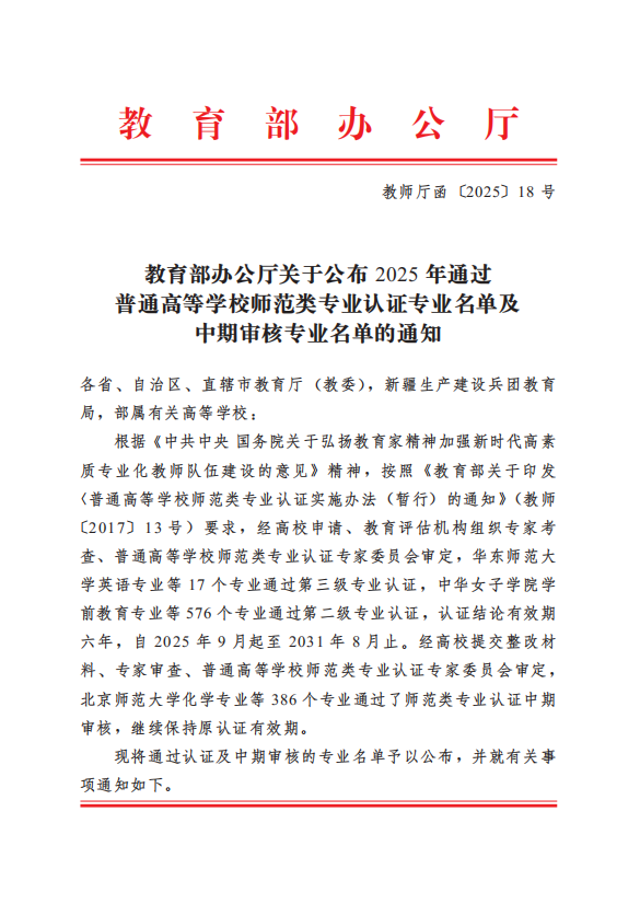 近日,教育部办公厅公布《关于2025年通过普通高等学校师范类专业认证专业名单及中期审核专业名单的通知》(教师厅函〔2025〕18号),我校美术学、物理学、教育技术学、英语、化学5个师范专业全部通过师范类专业第二级认证,认证有效期均为六年(2025年9月至2031年8月)。
