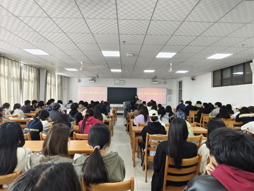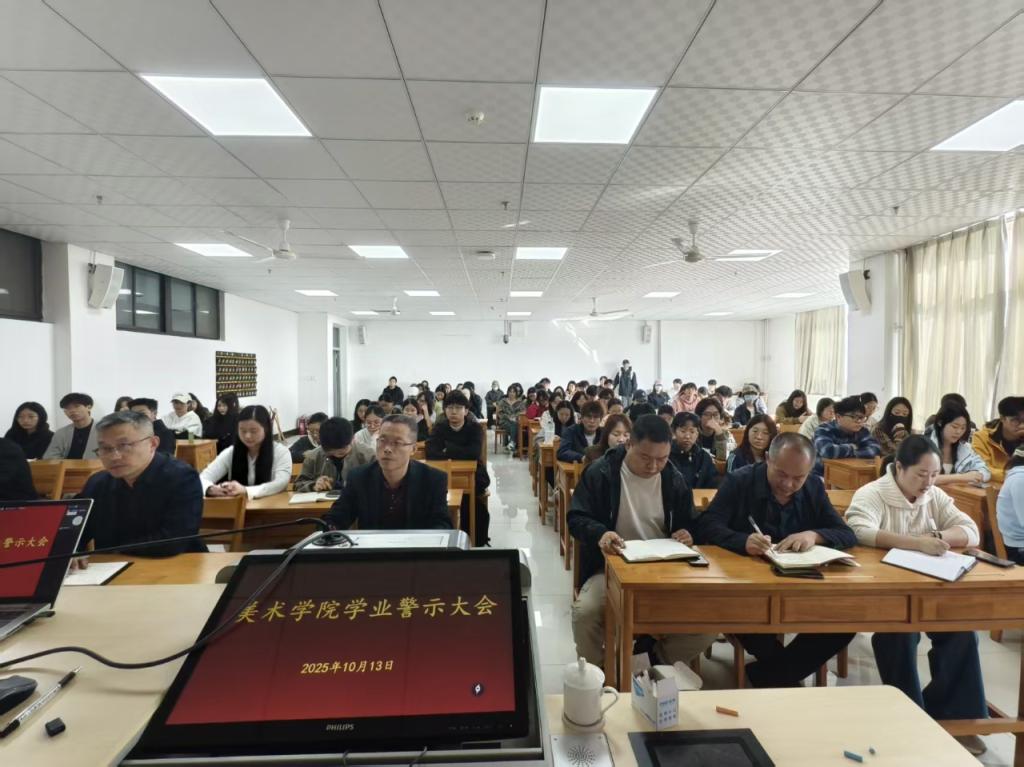 为确保2022级毕业生顺利完成学业,及时排查和解决学业环节中存在的问题,美术学院于10月13日下午在215教室组织召开毕业生学业警示大会。会议采取线上线下同步方式进行,学院党总支书记周德锋、院长石海彬、党总支副书记雷毅、副院长石洁,学工办副主任李媛媛、教学秘书李乐乐、毕业班辅导员及2022级全体学生参加。