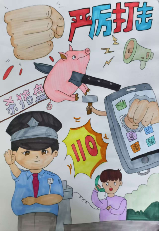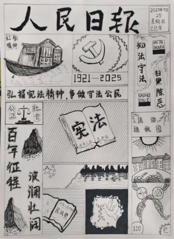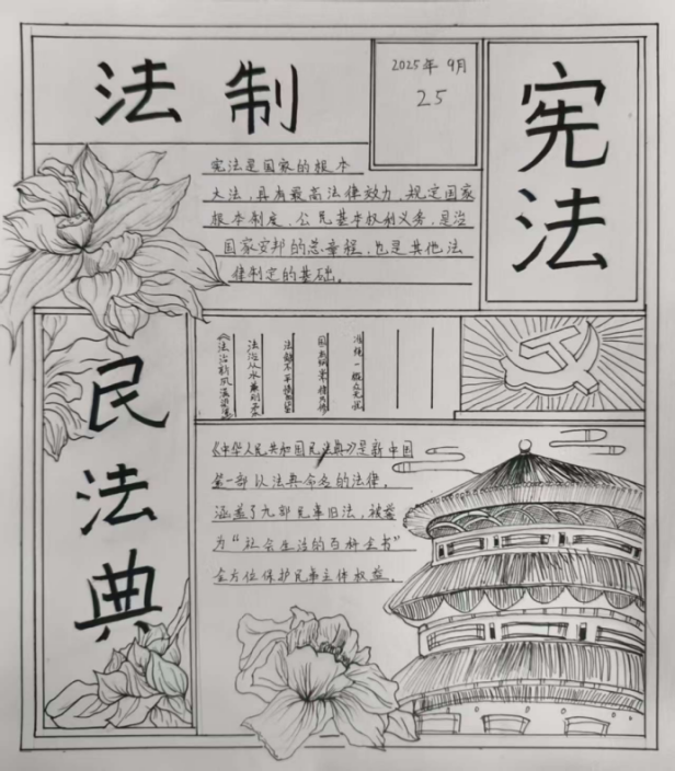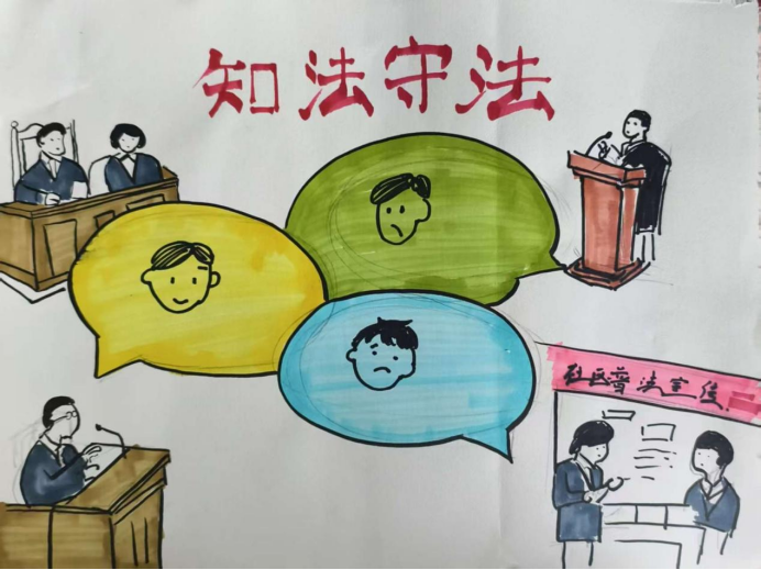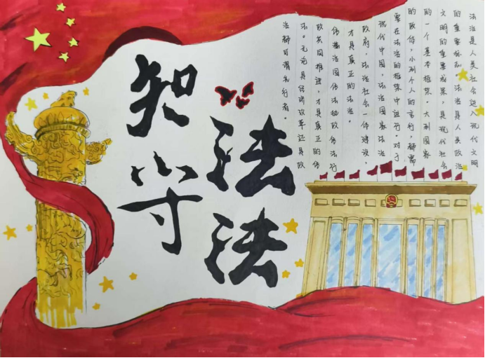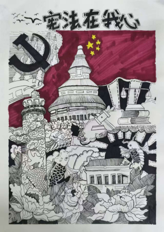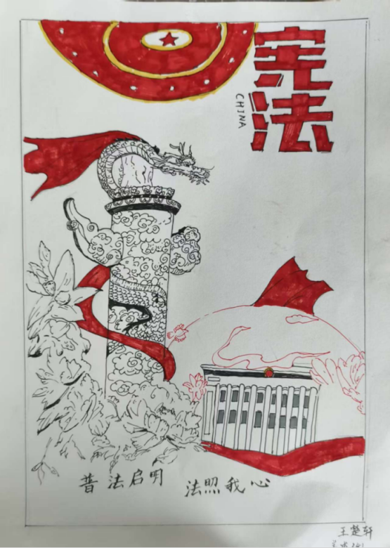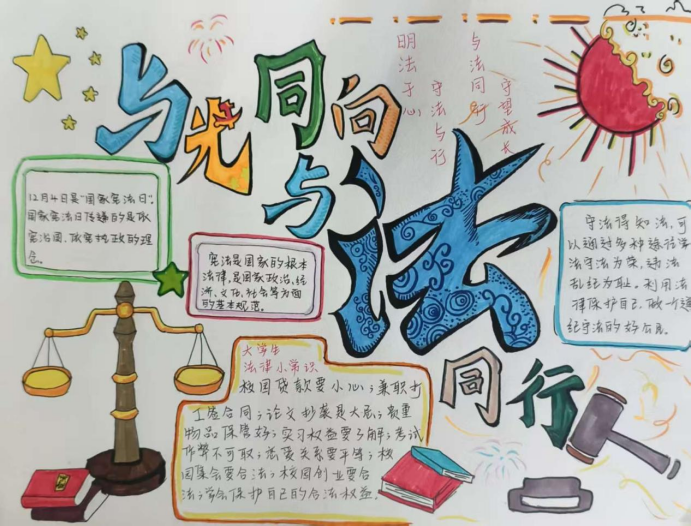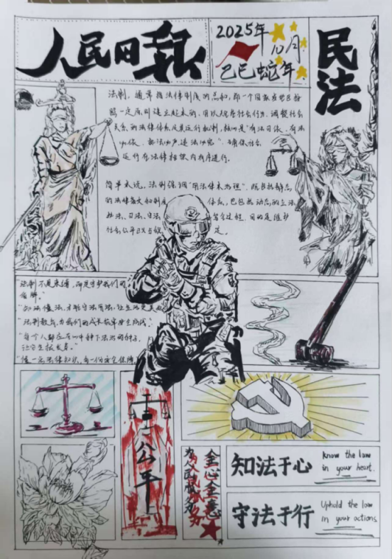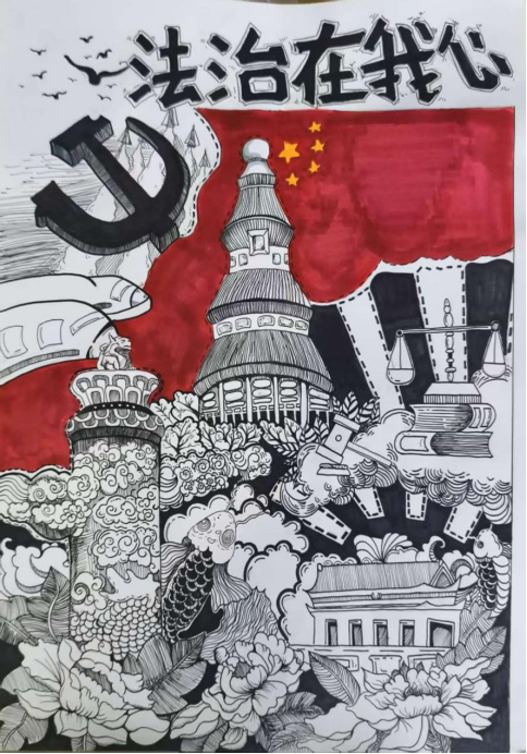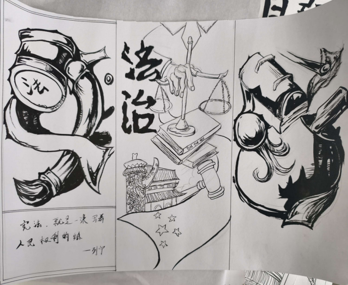在创作过程中,同学们认真研读法律条文,深入理解法治内涵,将“宪法至上”“公平正义”“权利义务”等法治元素巧妙融入艺术创作。有的作品以庄重的楷书书写法治名言,彰显法律威严;有的通过生动的插画表现网络安全、消费者权益保护等现实题材;还有的运用象征手法,以天平、法槌等元素喻示司法公正。