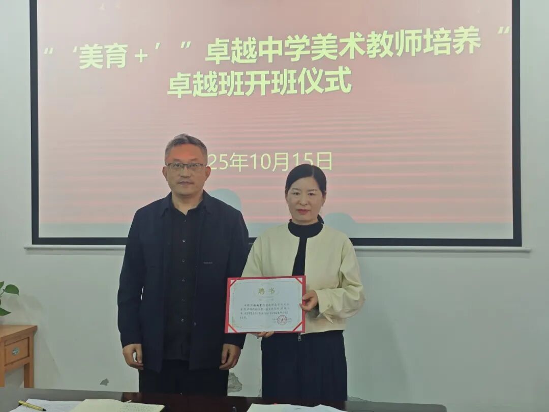 2025 年 10 月 15 日下午,美术学院 2025 级“‘美育+’卓越中学美术教师培养”卓越班开班仪式在学院会议室隆重举行。美术学院院长石海彬、副院长石洁、美术学专业负责人王月海、校外实践导师张海霞、教学秘书李乐乐、辅导员 谭广强与首届 30 名卓越班新生共同参加了仪式。仪式由副院长石洁主持。