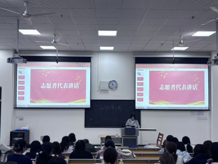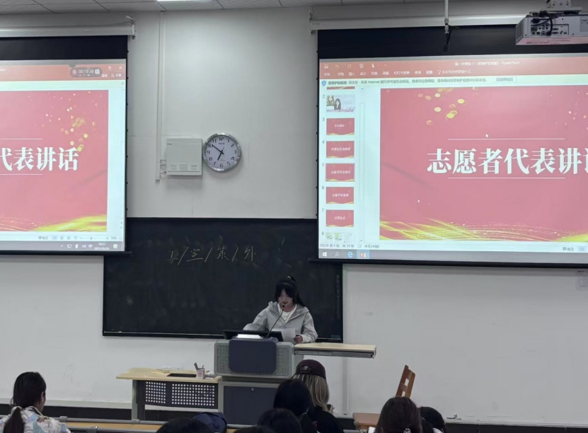 接下来,由宣传部副部长张佳晨代表部长团上台发言。她结合自身工作经验,向新志愿者们分享了在志汇青春志愿者协会中成长的心得。她强调了时间管理与平衡学习工作的重要性,鼓励新成员主动交流、敢于尝试,积极参与跨部门合作,拓宽视野。并代表部长团承诺,将为新成员提供“一对一”的指导帮扶,期待与大家携手为协会发展添砖加瓦。