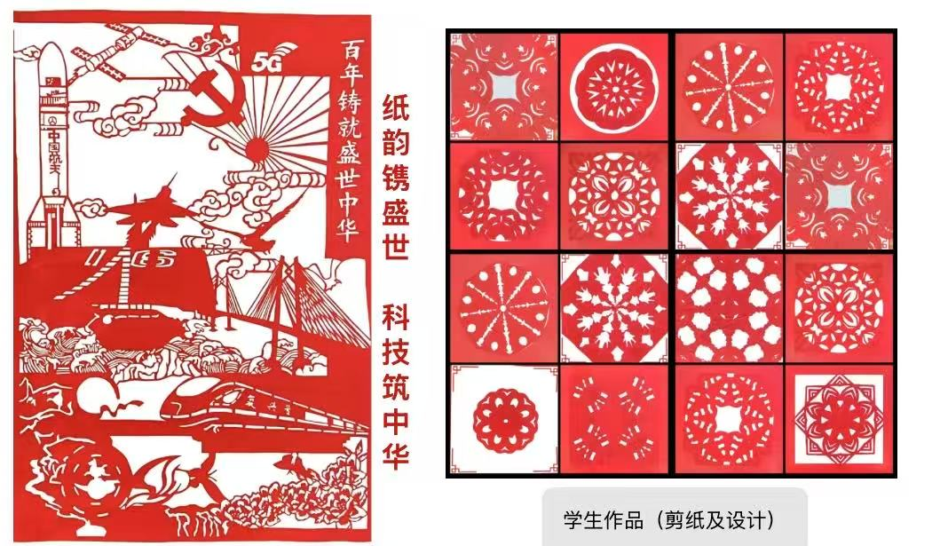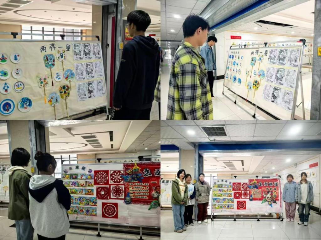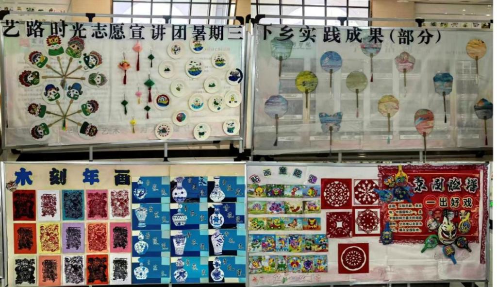 此外美术学院艺路时光志愿宣讲团将传统文化与艺术实践深度融合,自10月16日起在教学楼进行了为期一周的暑期“三下乡”社会实践小朋友们的成品展示。从充满童趣的贴画、精妙的剪纸、韵味十足的京剧脸谱,到极具艺术感的水拓扇、底蕴深厚的木刻年画与青花瓷作品,再到展现家国情怀的“两弹一星”主题创作,每一件作品都是实践成果的生动呈现。这些作品不仅吸引了众多师生驻足欣赏,更在艺术创作与文化传承的碰撞中,书写了青年学子以艺践行、传承文化的青春篇章。