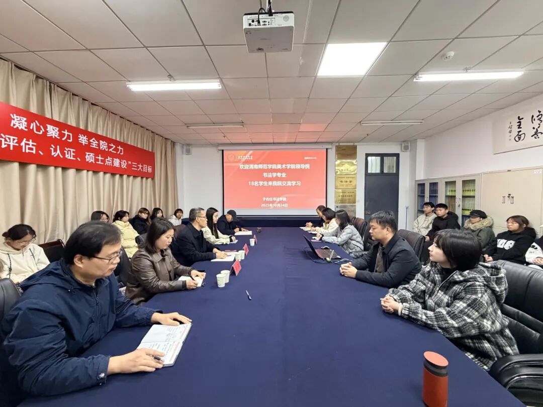 10月24日,美术学院党总支书记周德锋、副院长石洁带队,欢送18名25级书法学专业学生前往咸阳师范学院于右任书法学院,开启为期一年的交换学习之旅,并与咸阳师范学院于右任书法学院党委书记计谋远、副院长徐淑坤及辅导员班主任开展座谈交流。