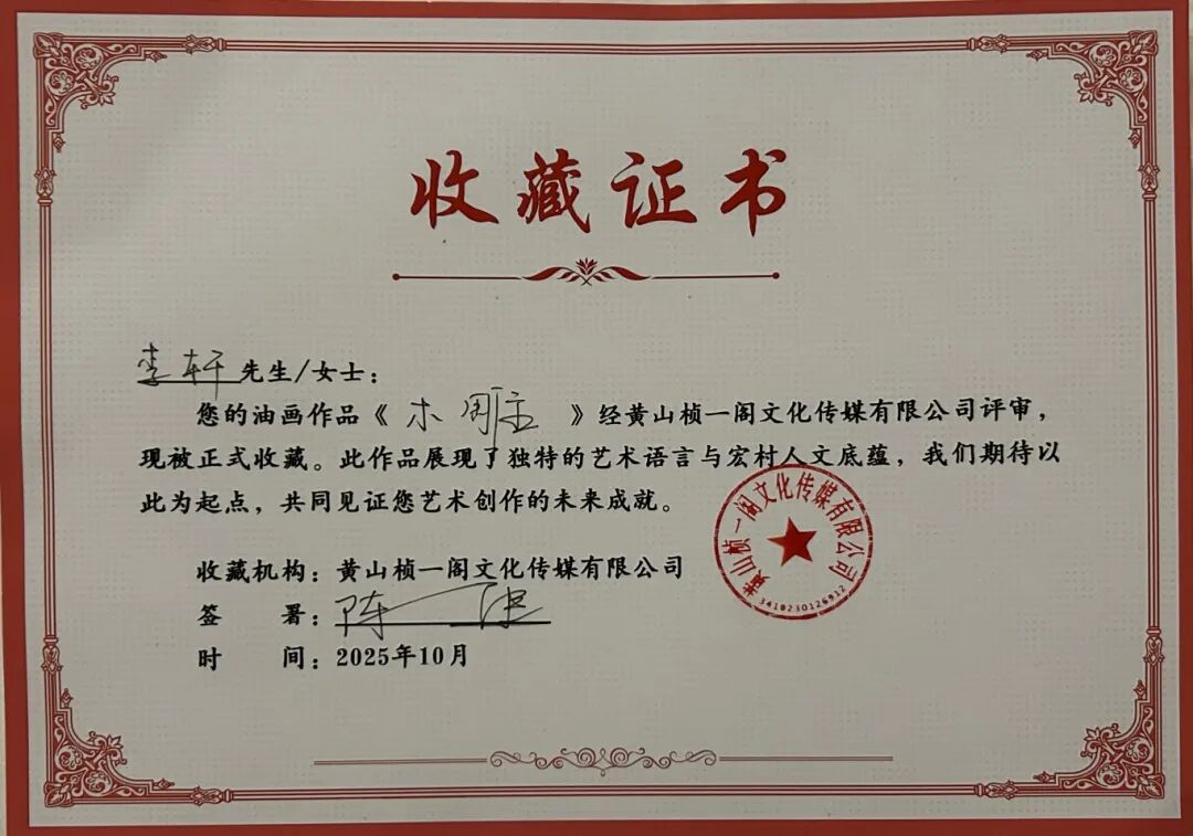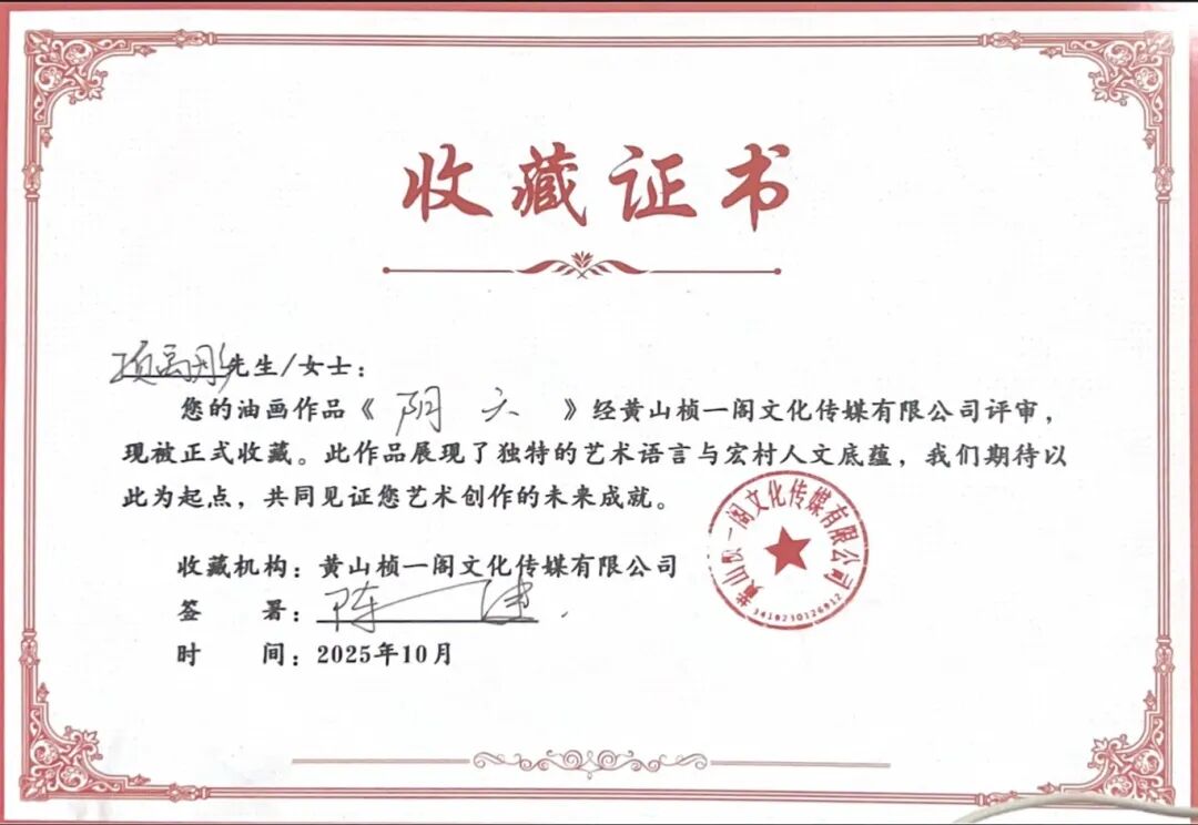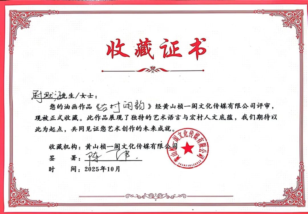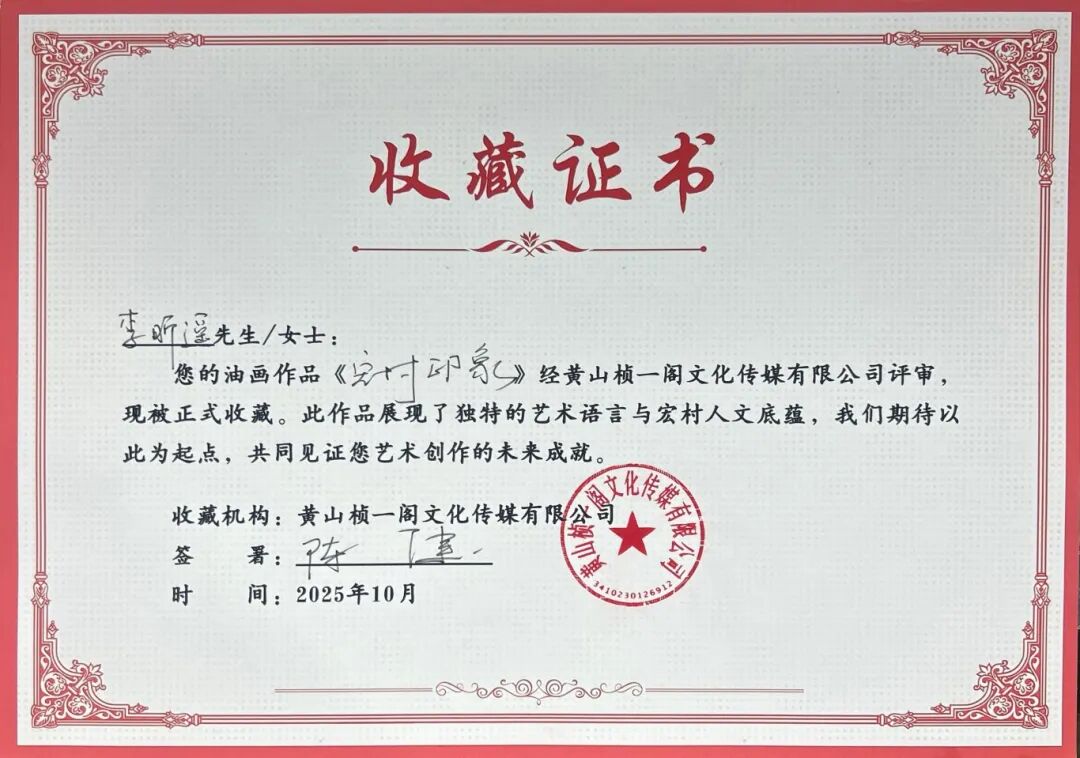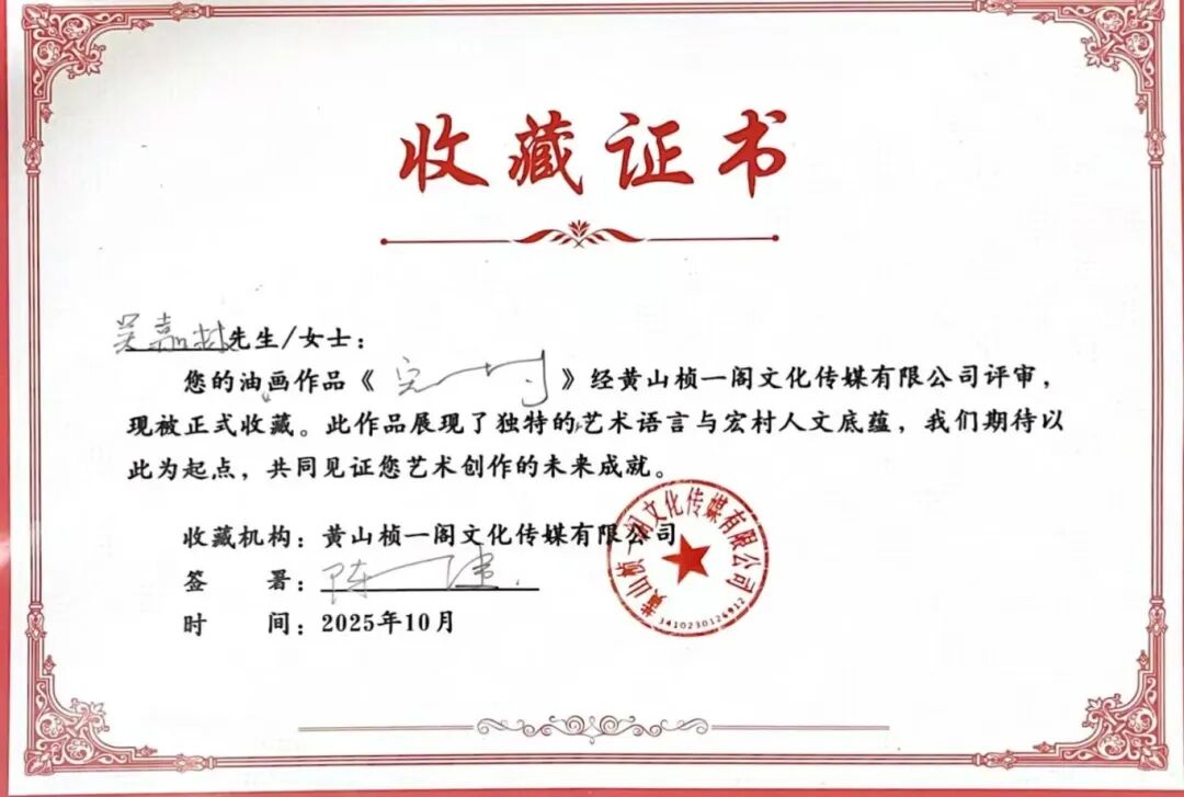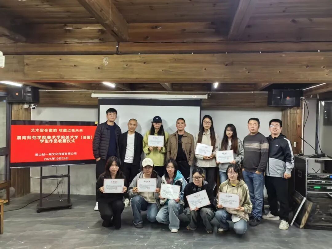 2025年10月26日,在我院美术学专业油画方向本科生秋季写生课程即将结束、师生准备返校之际,一场别开生面的作品收藏仪式在宏村写生基地现场举行。黄山桢一阁文化传媒有限公司陈健先生在观看了我院学生的写生成果后,当即决定有偿收藏8幅油画作品。