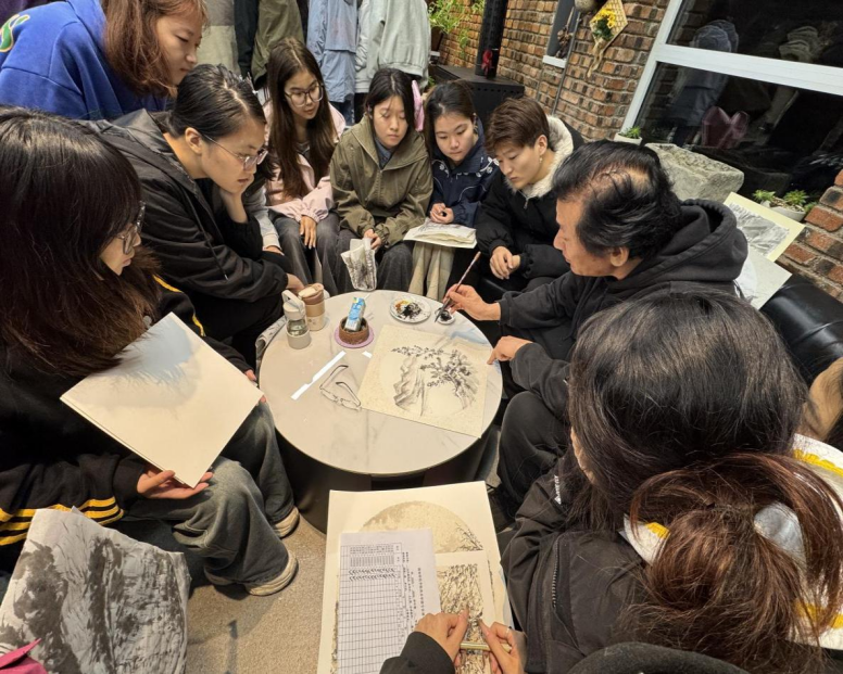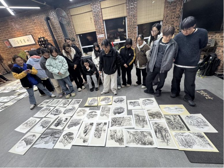四位指导教师的日常评画教学则贯穿活动全过程,成为提升学生创作水平的关键。老师们会围绕学生作品逐一点评:指导学生进行笔墨语言的自我锤炼,用笔墨表现太行山石的厚重感;聚焦构图布局,帮助学生优化画面主次关系;引导学生学会观察,于万千自然气象中学会取舍;结合传统画论,讲解如何将太行山水的精神气质融入创作。评画现场,师生互动频繁,同学间也相互借鉴思路,在交流探讨中共同进步,展现出团结协作、积极向上的优良学风。