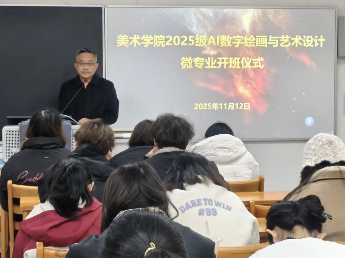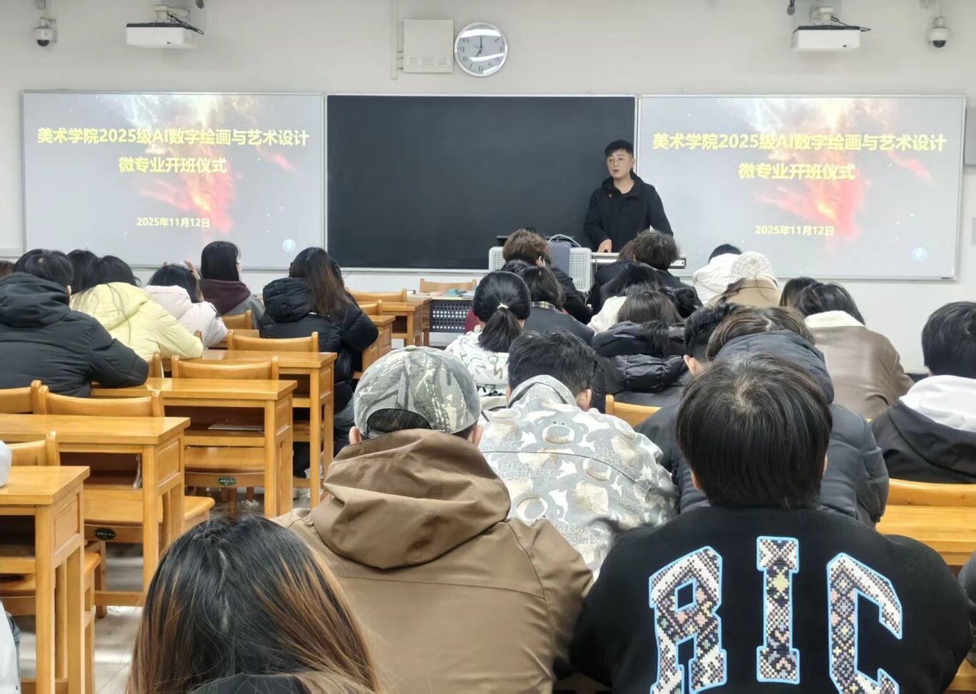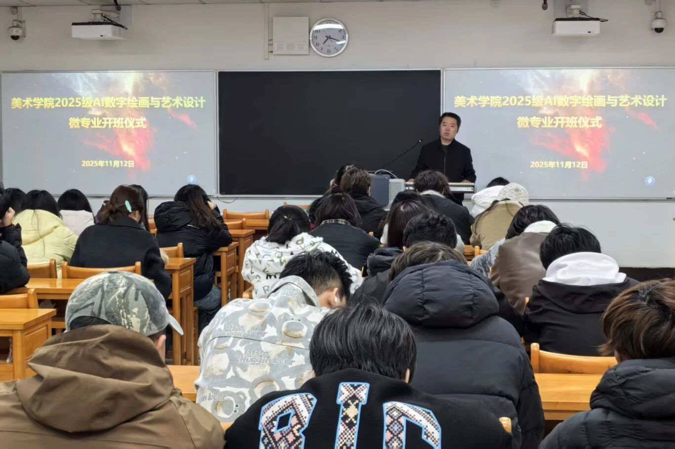 11月12日晚,2025级“AI数字绘画与艺术设计”微专业开班仪式在富平校区美术学院顺利举行。美术学院院长石海彬,微专业负责人尹琨,专业教师张巍译等及全体学生参加仪式。