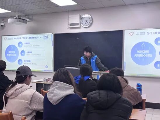 宣讲过程中,团队成员运用PPT与纪实科普短片,生动阐释了核能“三步走”战略的技术演进路径、阶段目标及其在降低碳排放、缓解资源约束、筑牢能源安全屏障方面的重要作用。通过国内外典型案例分析、不同阶段核电工程能耗对比以及核燃料循环利用效率解读,同学们更加清晰地认识到,核能“三步走”战略是推动能源结构清洁转型、实现“碳达峰、碳中和”目标的关键支撑。