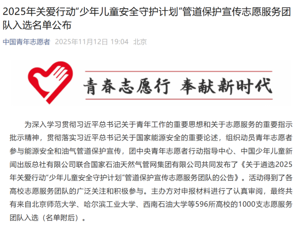 11月12日,团中央青年志愿者行动指导中心、中国少年儿童新闻出版总社有限公司联合国家石油天然气管网集团有限公司共同发布了2025年关爱行动“少年儿童安全守护计划”管道保护宣传志愿服务团队入选名单。美术学院“星火丹青管道护童志愿宣讲团”项目,从全国多所所高校的团队中脱颖而出,成功入选国家级志愿服务团队。