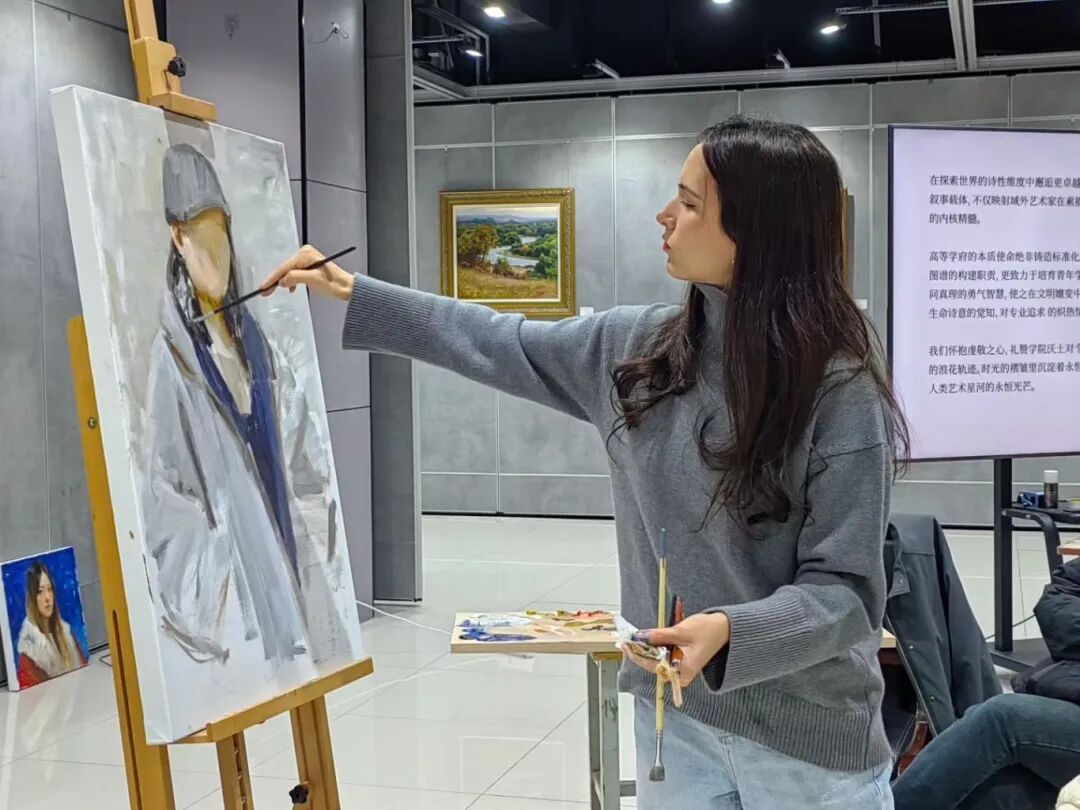课程开始,阿丽莎·谢苗诺娃老师进行了油画半身像示范。她从构图起稿、色彩铺陈,到形体塑造、细节刻画,全程边画边讲,深入解析油画语言中形色结合的要点。在教师示范的同时,部分学生开始进行水粉画实践。阿丽莎·谢苗诺娃老师依据水粉材料的特性,指导学生掌握色彩过渡的处理方法、水分的控制技巧以及增强画面表现力的方式。尽管水粉与油画有所不同,但在色彩归纳和画面节奏方面存在共通点,关键在于学会化繁为简。