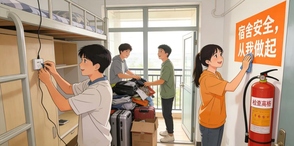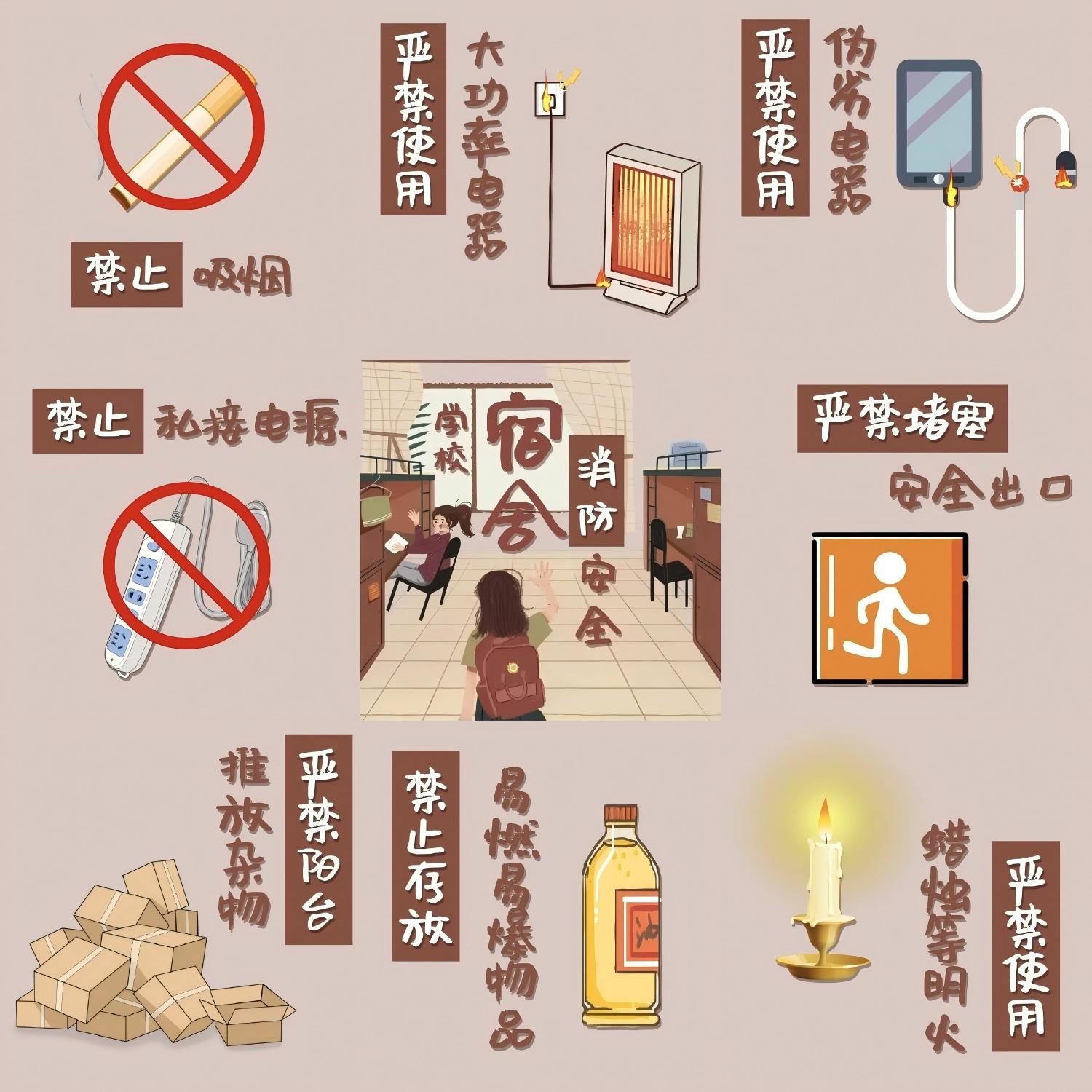 宿舍安全:严禁私拉乱接电线、使用大功率电器(如电煮锅、电热毯);手机、充电宝避免整夜充电,充电时远离床铺、衣物等可燃物;不将宣纸、课本等易燃物堆积在电源旁。