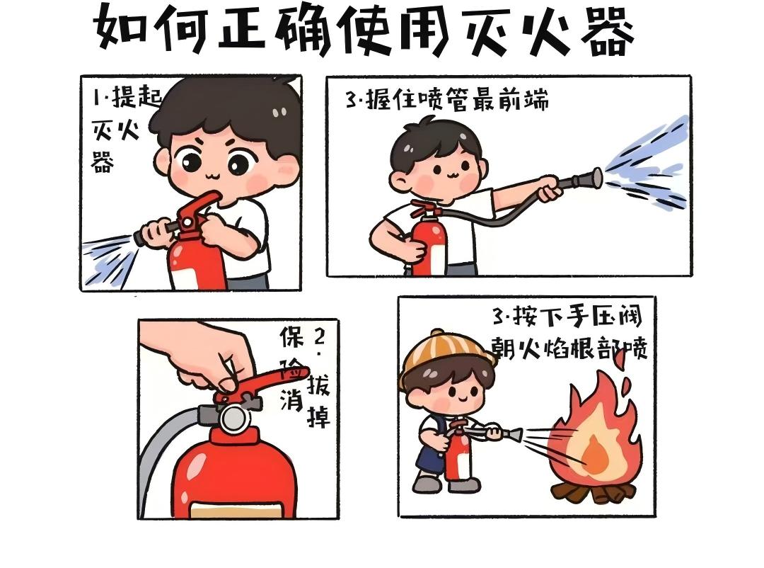 关键时候能“救命”,牢记消防器材使用方法,遇到初期火情能快速处置:一、干粉灭火器(画室、宿舍楼道均有配备)操作遵循“提、拔、握、压”四步: