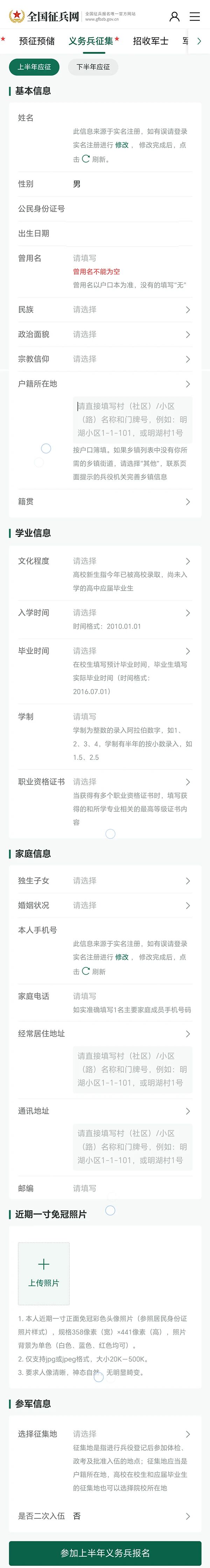 进入下图页面后,按要求填写信息,填写时一定要看后面注明的相关要求,最后在下面选择“参加上半年义务兵报名”: