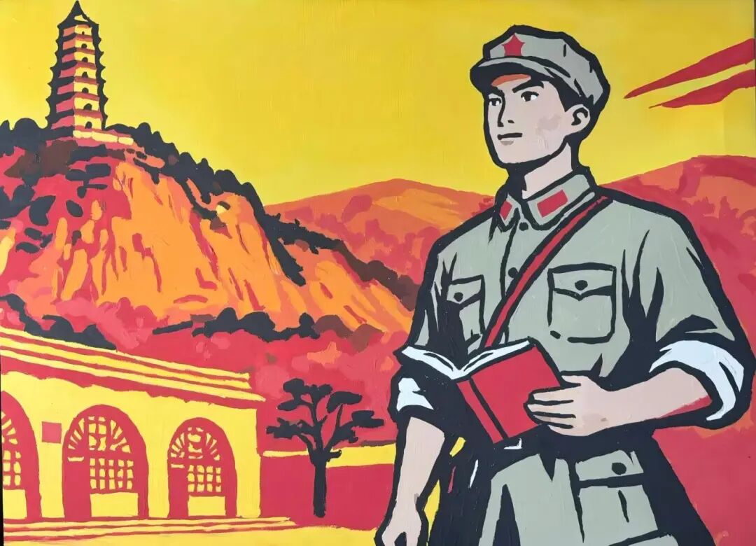 背景里的宝塔山是精神坐标,黄与红的主色调既是黄土高原的底色,也象征理想的炽热;建筑的窑洞式拱门,呼应着“从群众中来,到群众中去”的初心。人物手中的红色书籍,既是历史的“课本”,也是当代青年的“精神手册”——我们读的是先辈的故事,践行的是“实事求是、艰苦奋斗”的延续。
