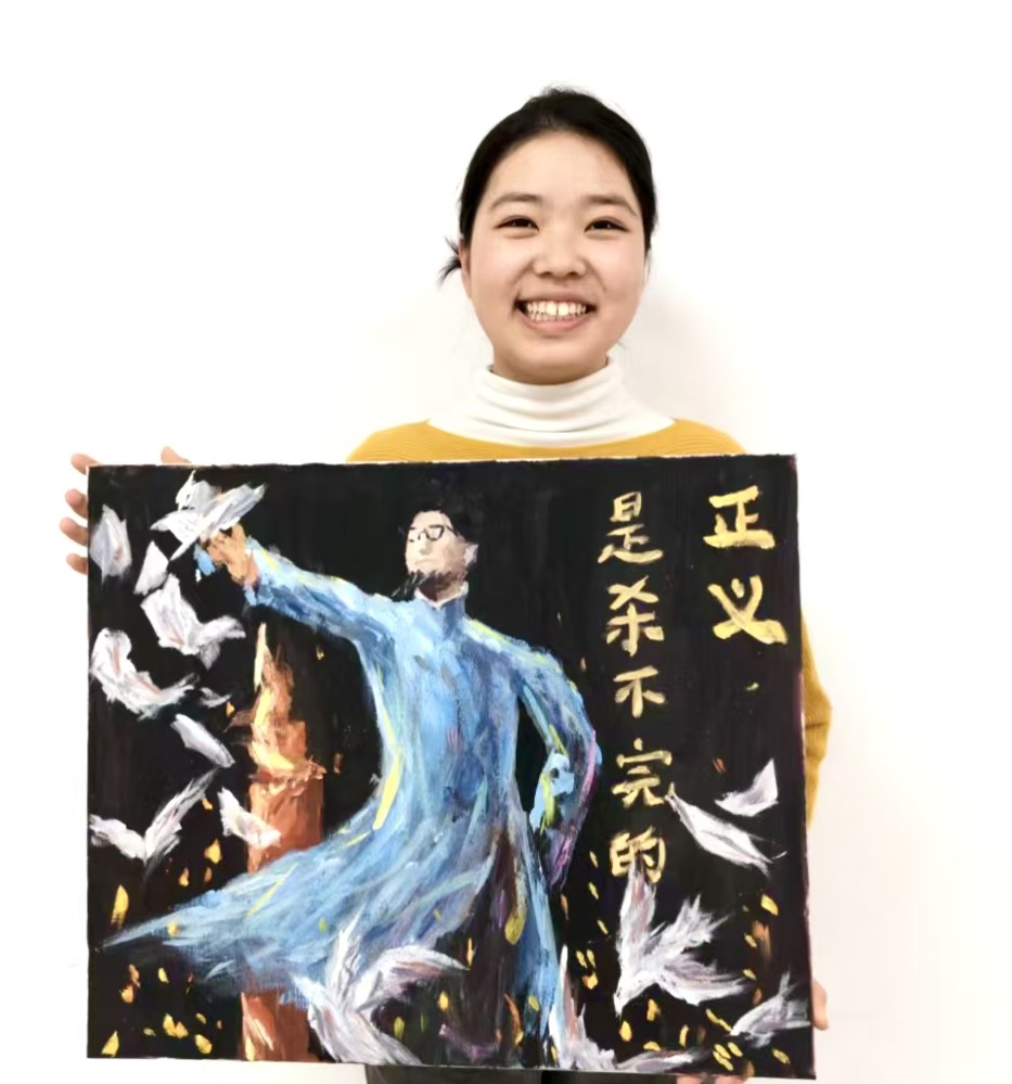 此次创作以弘扬延安精神为核心,将延安精神与所学专业结合起来,传递自己对先辈的崇敬。正义是杀不完的,出自于《最后一次演讲》中闻一多先生演讲的话,因为闻一多先生写过一篇名为红烛的诗,所以有一个象征红色革命精神的蜡烛,底下的星星点点象征着星星之火,可以燎原,撕碎的书页变成象征和平的白鸽。整幅作品意喻先辈们的热血奋斗,才造就了我们和平美好的今天。