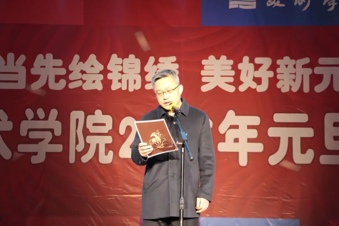 院长石海彬在致辞中说到,回望2025年,美院人以汗水为墨、以坚守为笔、以热爱为色,用行动诠释了建设教育强国的使命与担当。展望2026年,学院将继续深耕艺术沃土,以创新为翼、以责任为魂,持续深化教育教学改革,着力提升人才培养质量,推动学院各项事业再上新台阶。