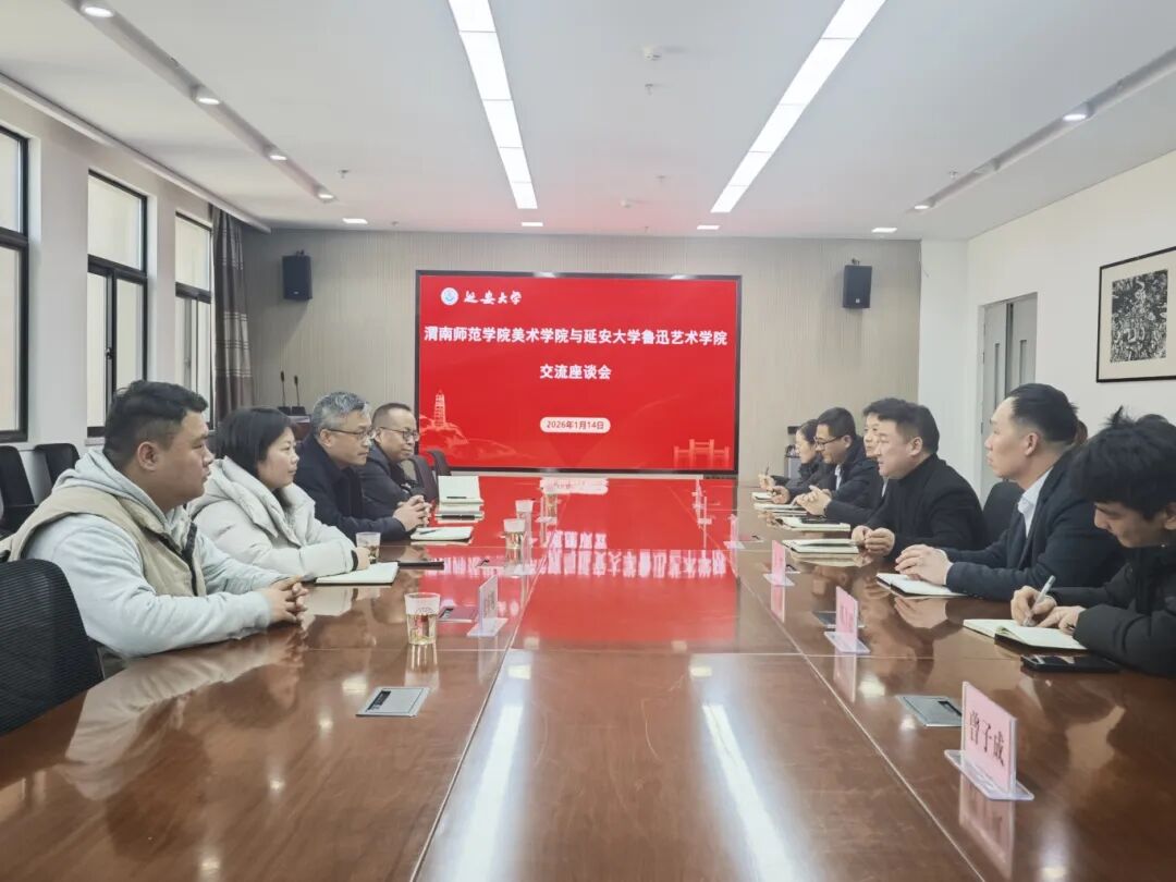 为对标优质院校、精进教学科研质量,1月14日,美术学院院长石海彬带队,副院长刘涌涛、石洁等一行5人赴延安大学鲁迅艺术学院开展调研交流。延安大学鲁迅艺术学院院长李延俊、副院长李辉、兰庆炜、教学秘书曾子成和相关教师代表参与座谈。